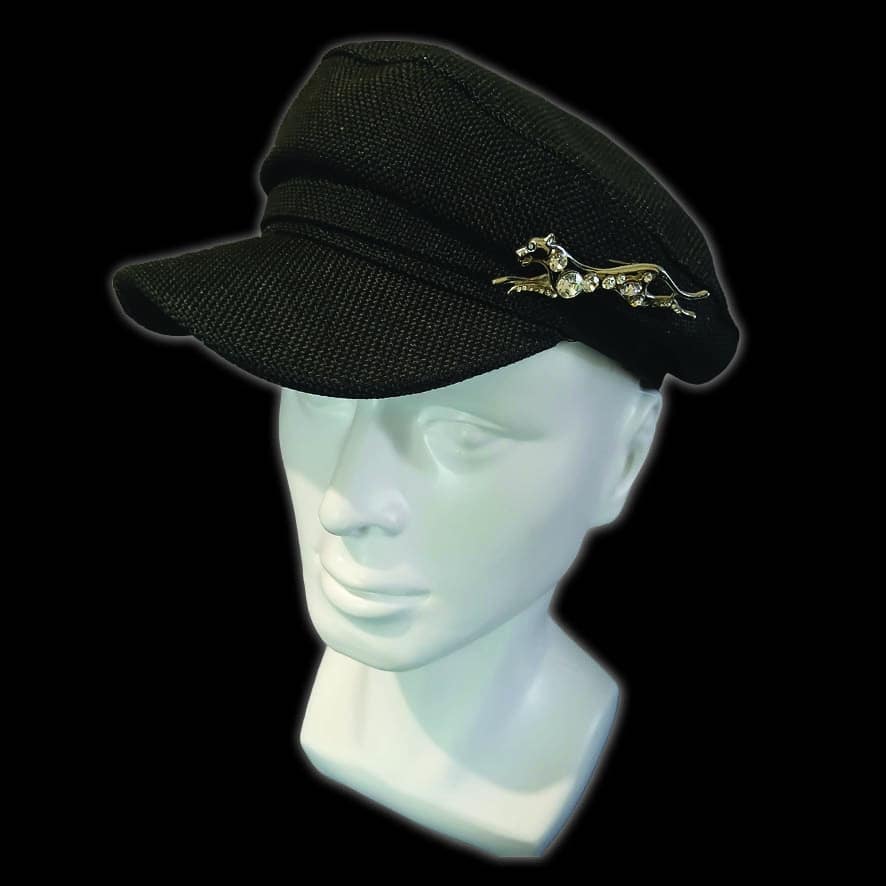 Black denim look cap with a vintage bejewelled prancing leopard brooch.