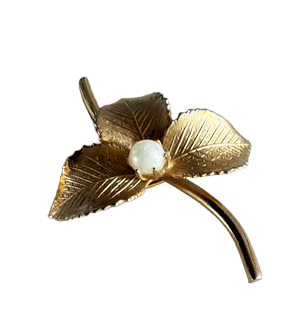 Golden trio is a Vintage gold tone three-leaf faux pearl brooch