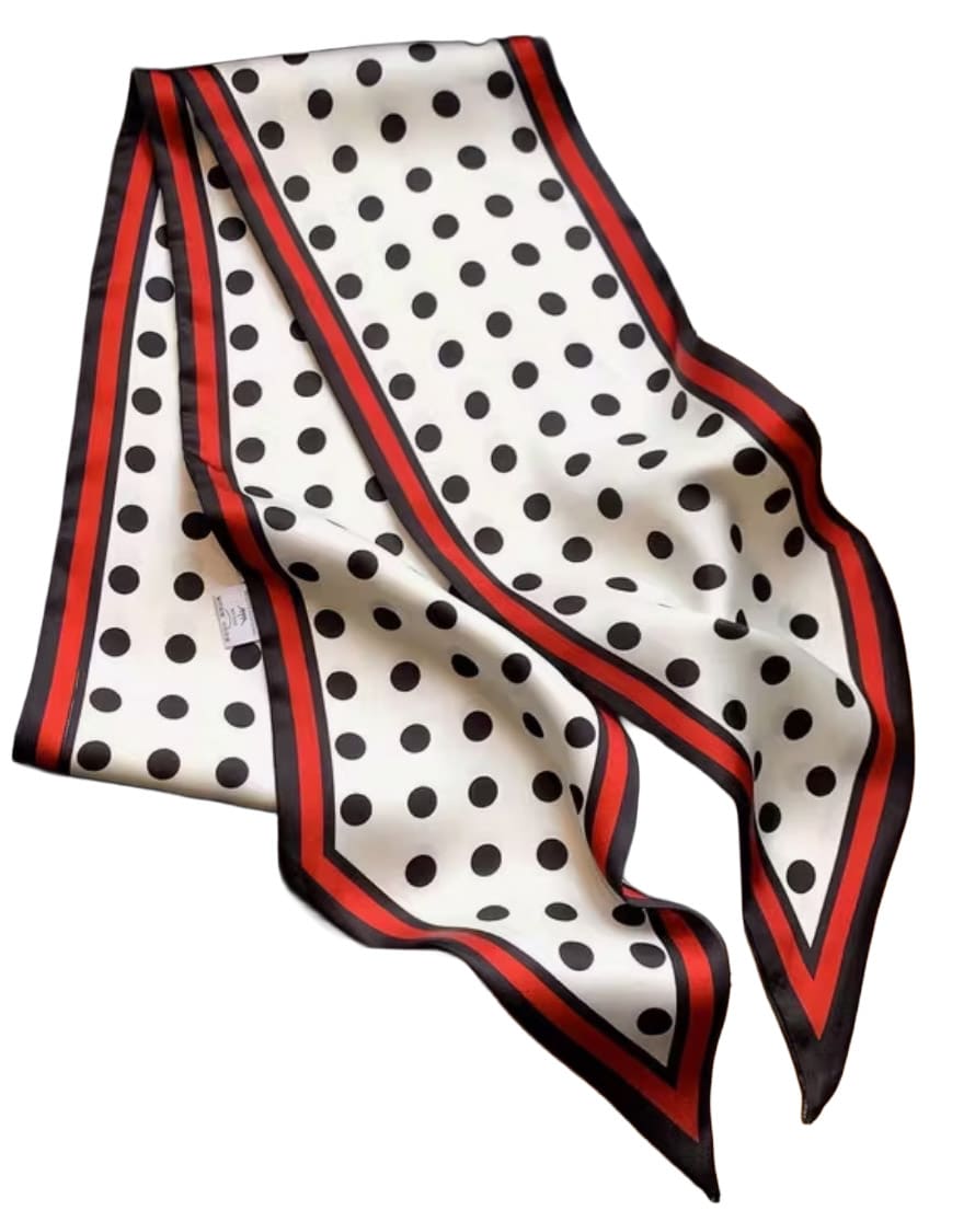 Poke a Dot is a red white and black polkadot scarf which isa great accessory to liven up anything you wear, from belts to hair, handbags and of course your neck.