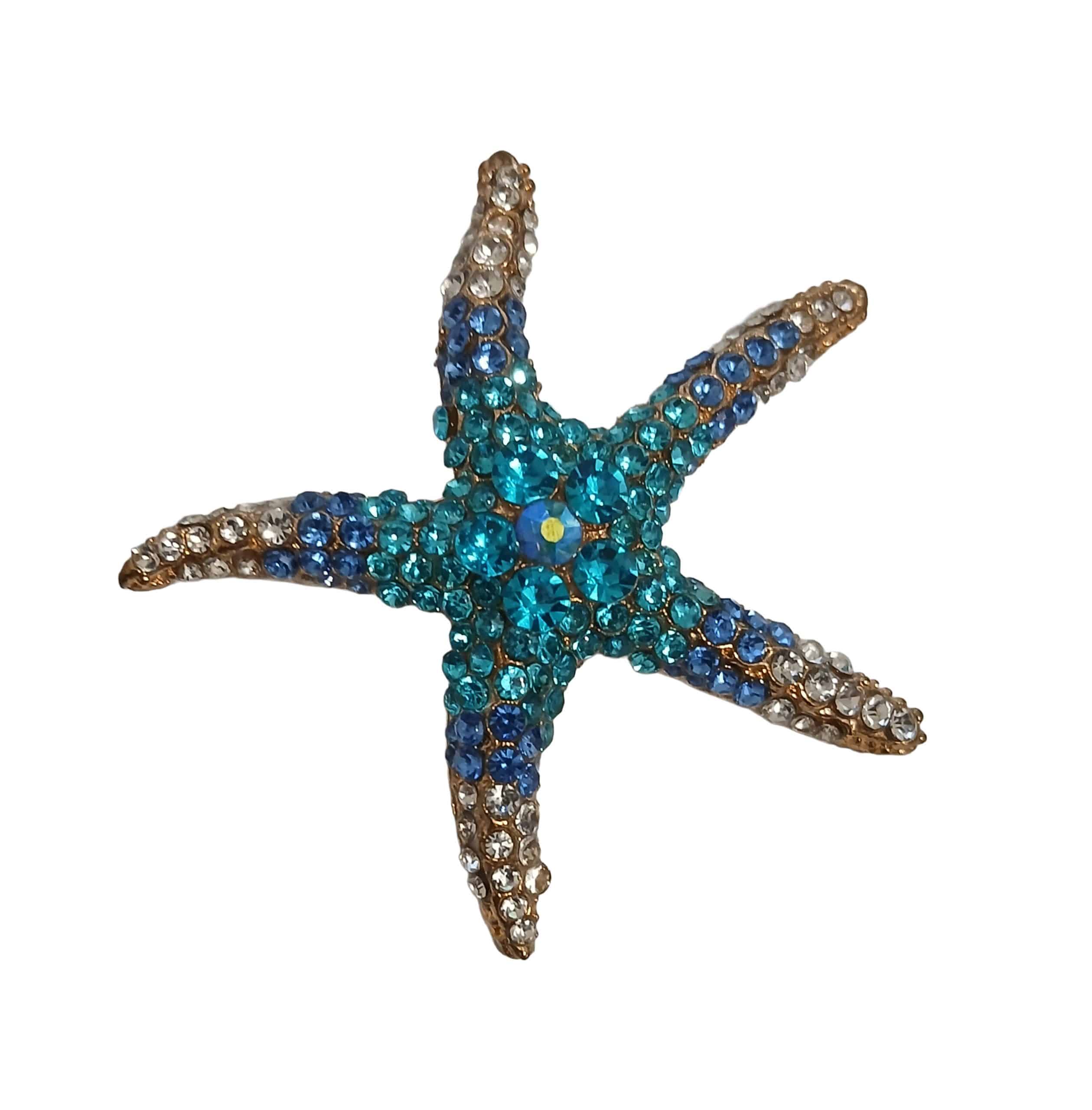 Blue Starfish is a vintage-look brooch depicting a bejewelled starfish of blue and clear rhinestones on a silver tone setting.