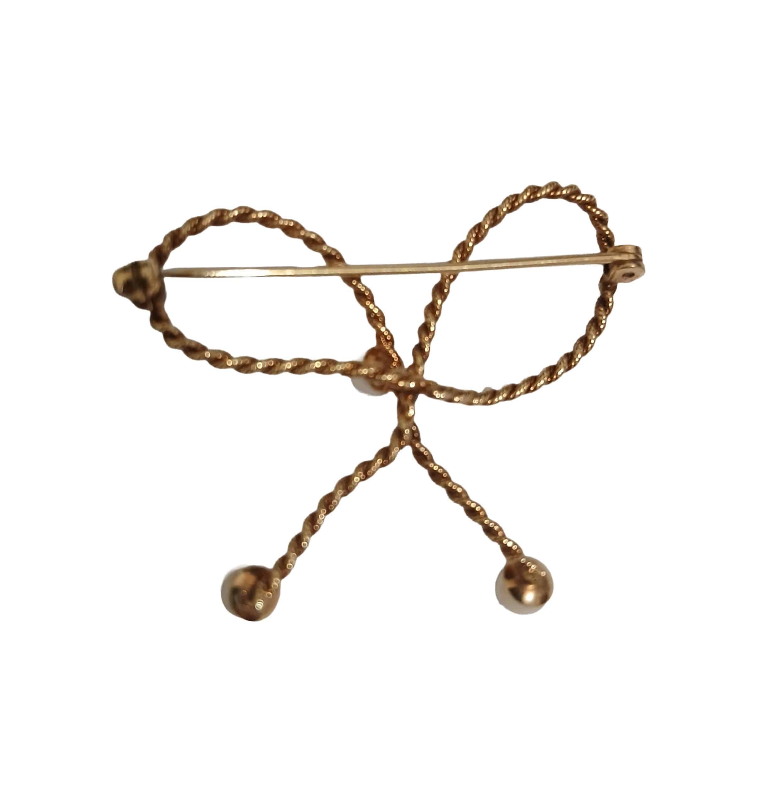 String Bow is a vintage brooch delicately crafted with real pearls on gold twisted rope setting.