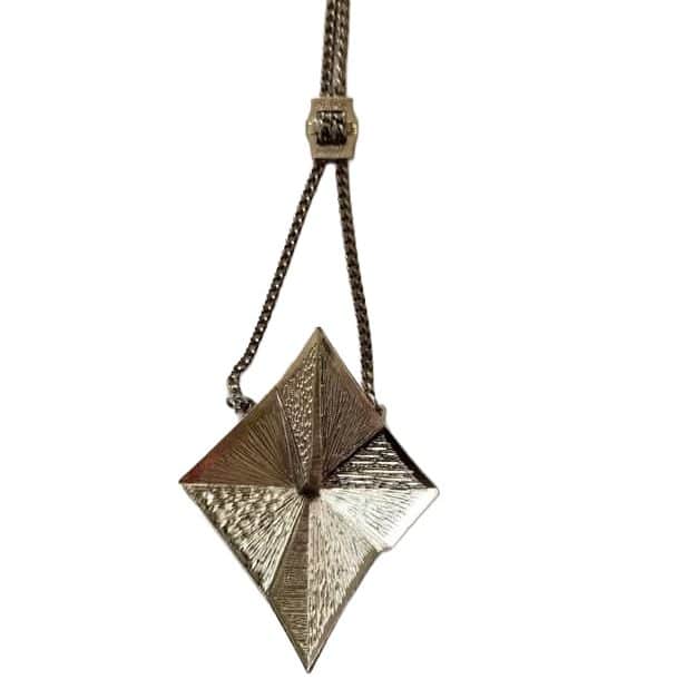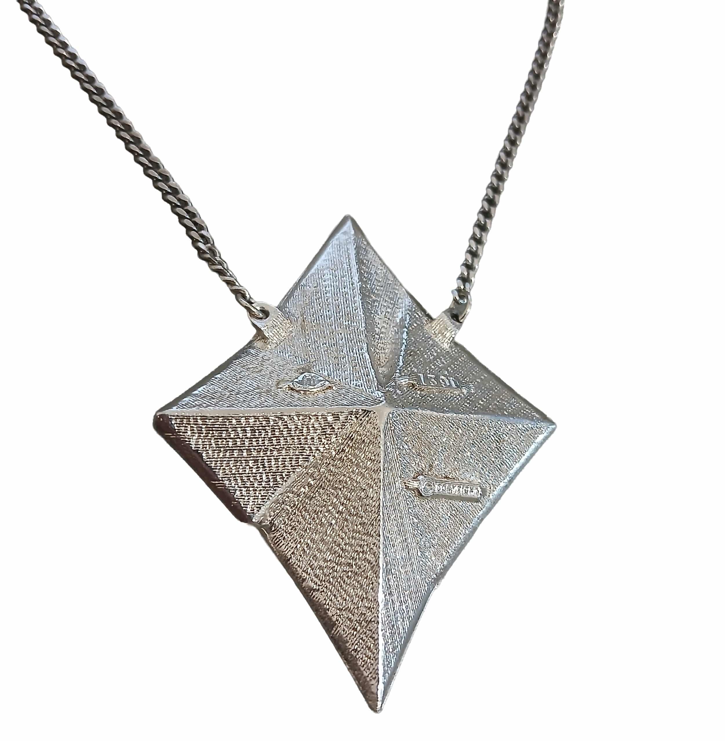 This Brutilist inspired vintage pendant is stamped on the back – Arcansus Elizebeth Reimer. The colour is silver it has original chain with a unique adjustment buckle. Our test, along with the 1391 stamp on the front lead us to believe that this is sterling silver. This is definitely a collectors item and is not just a beautiful pice of jewellery, but potentially a great investment which is likely to continue to appreciate in value.