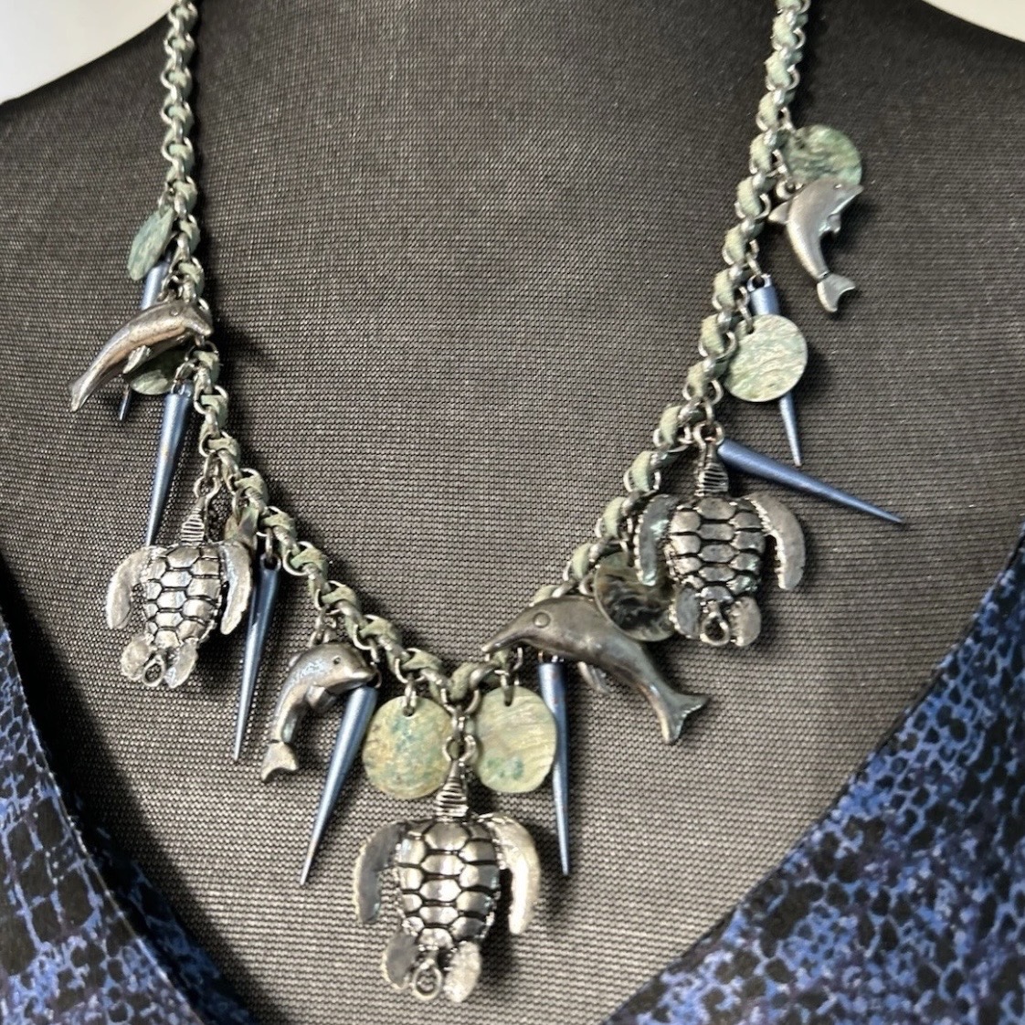 Azure is an artfully crafted vintage necklace with a netfull of dolphins, turtles and other charms in golden and blue tones.