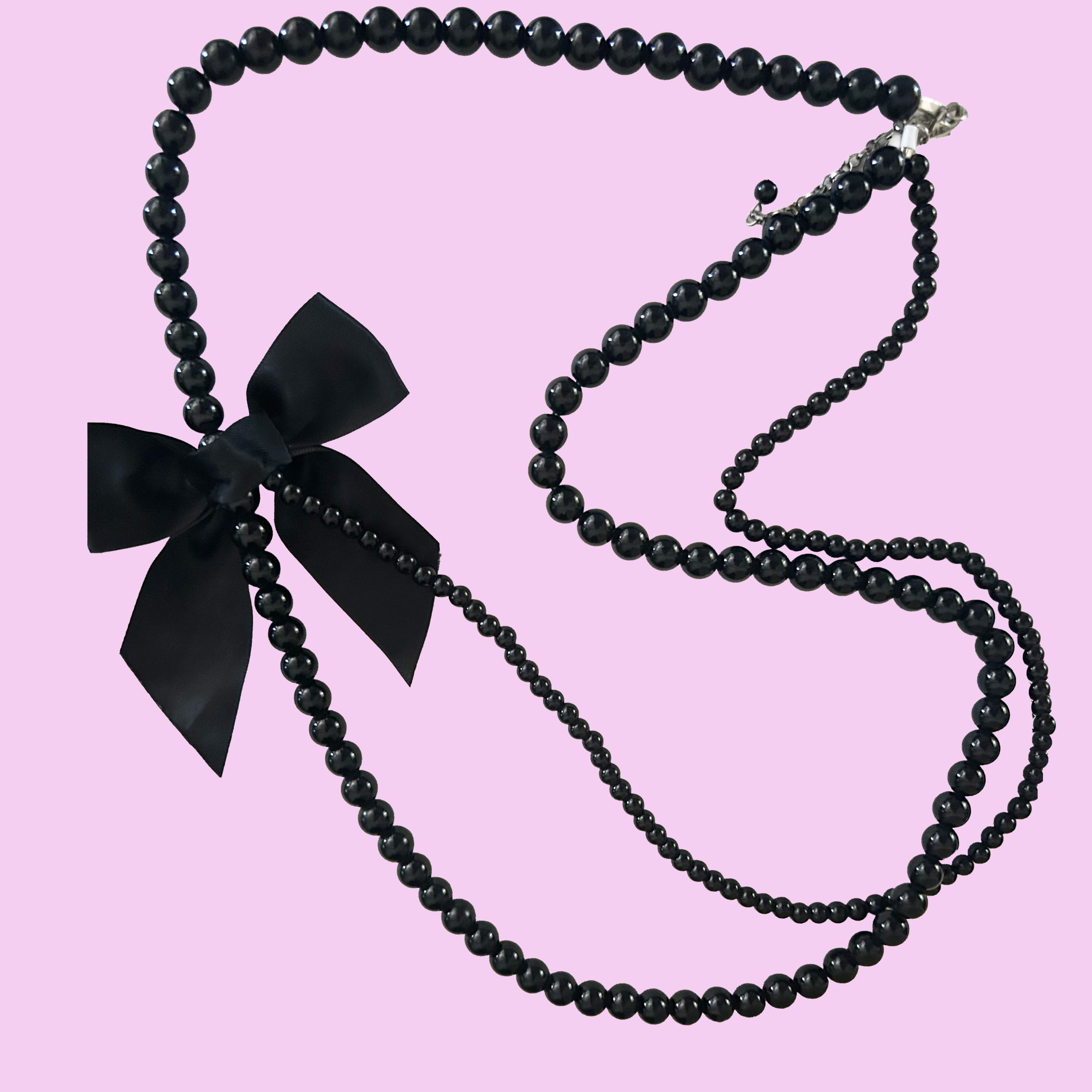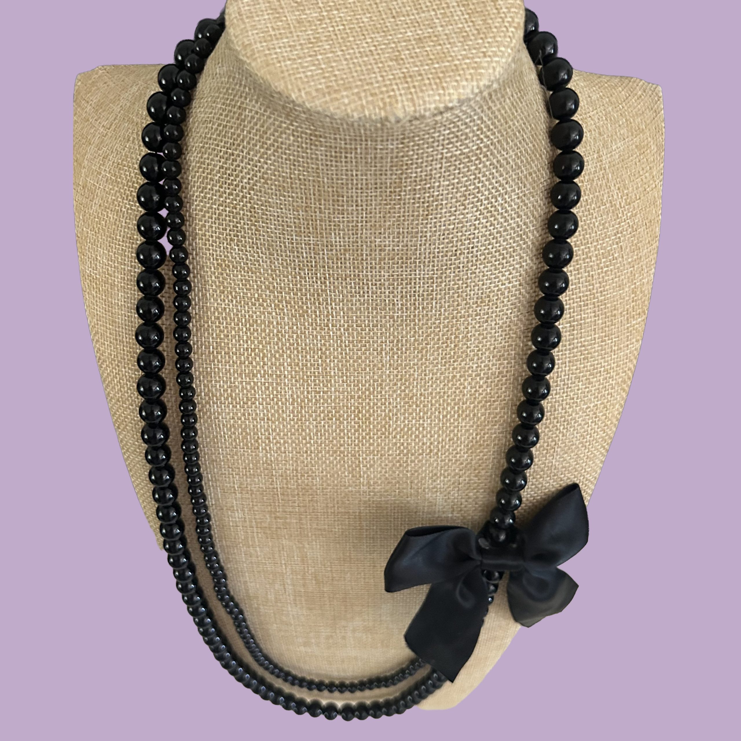 A fabulous double strand of vintage black glass beads, accented with a perky bow.