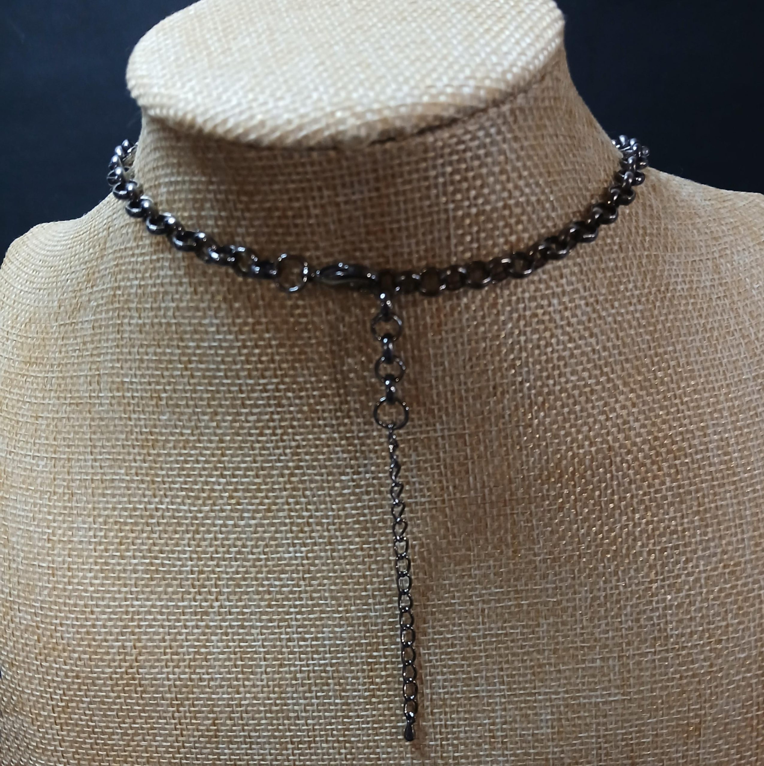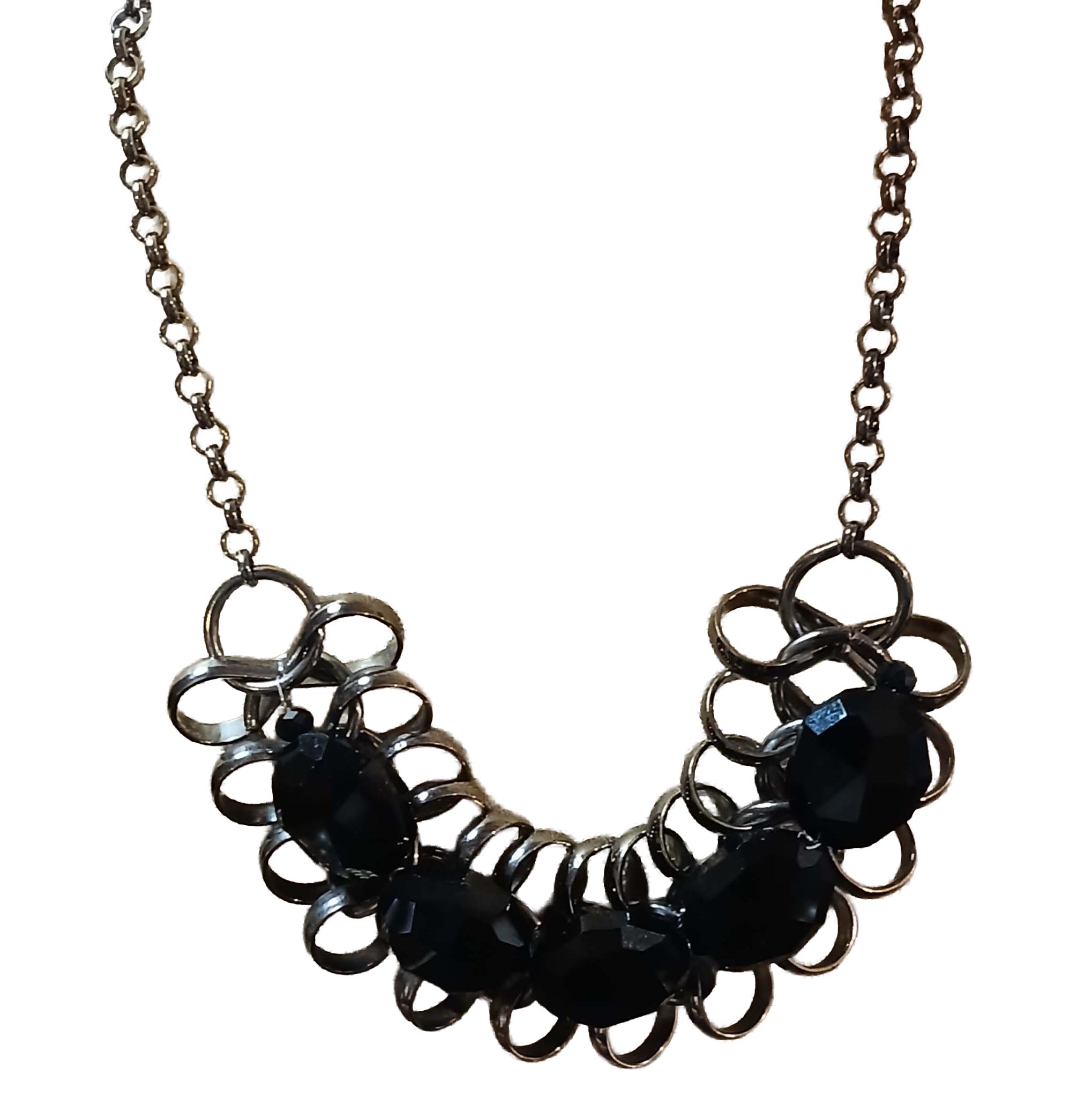 Carla is a vintage necklace of black facetted beads with bronze tone metal accents.