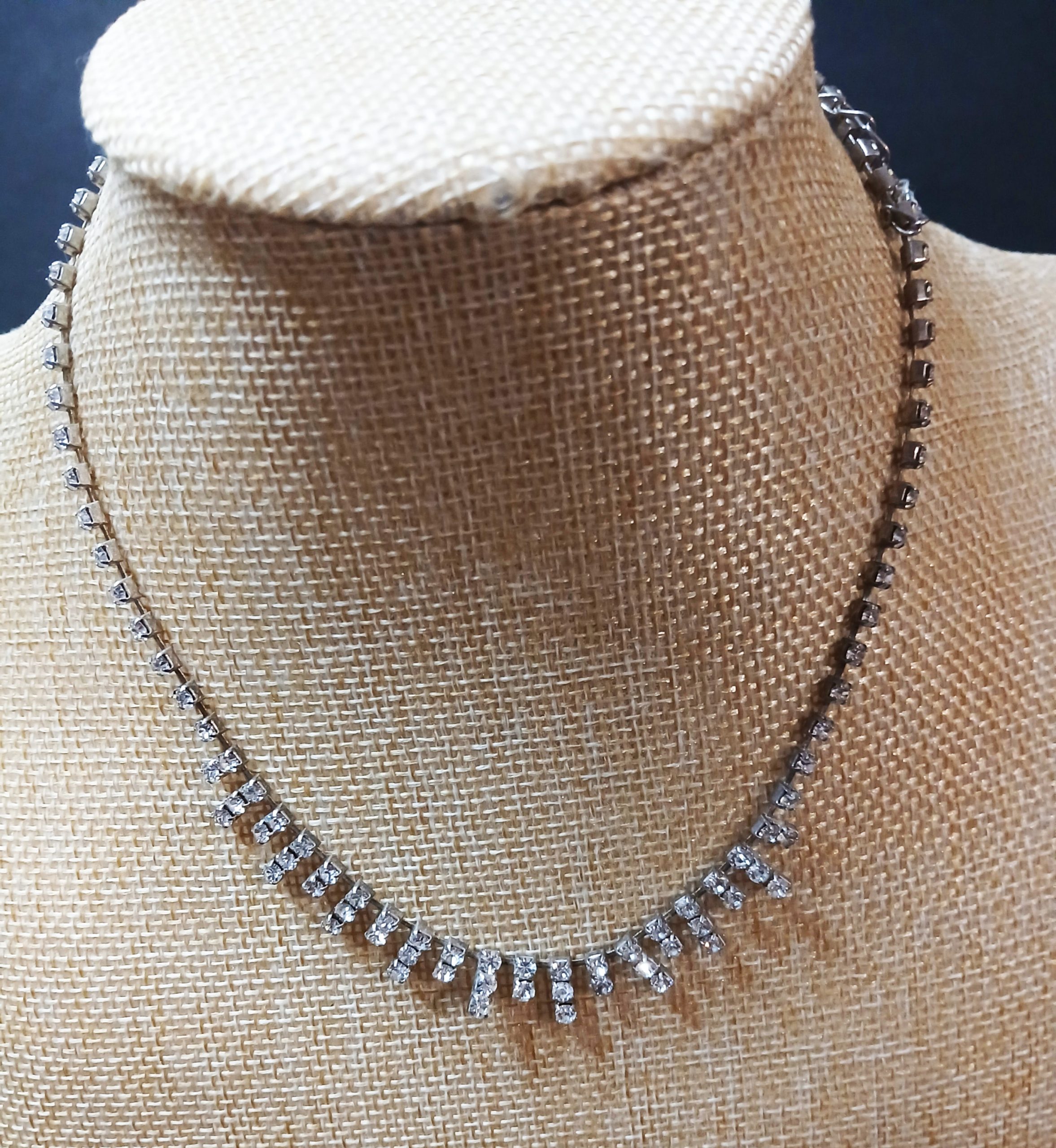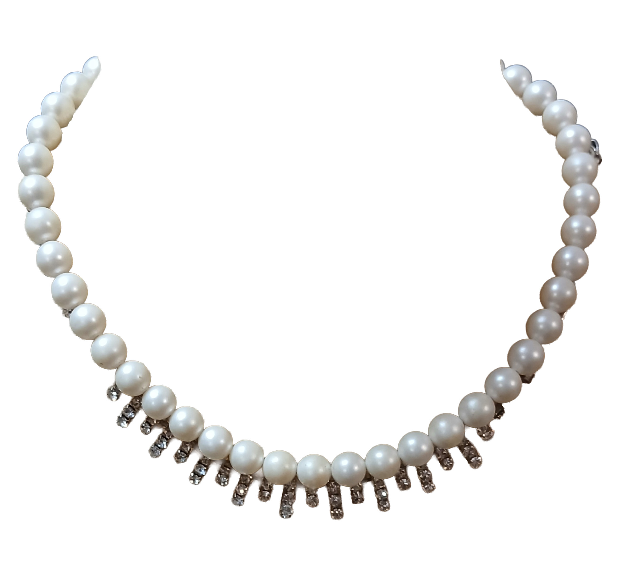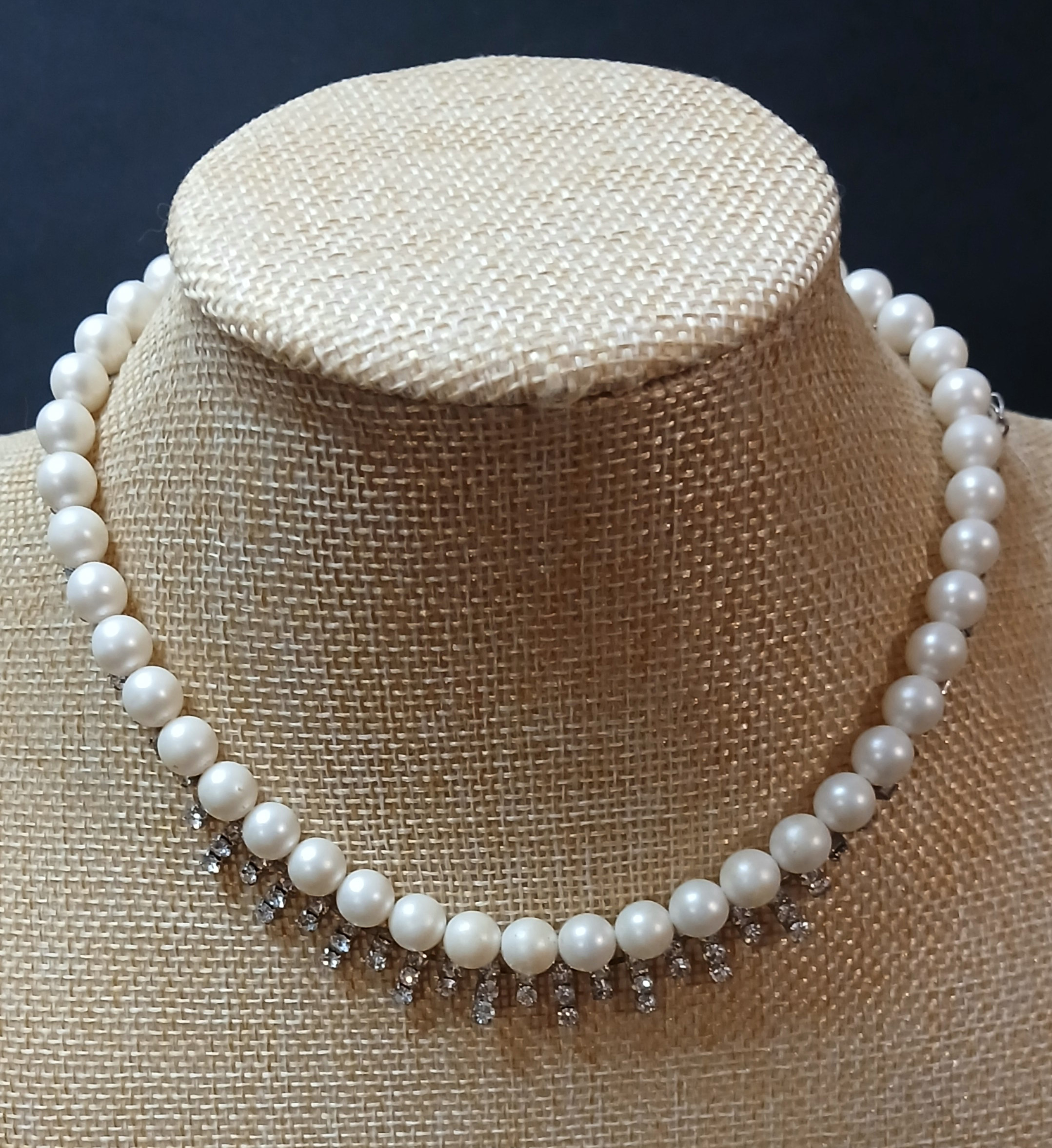 Dream Suite applies the popular, contemporary technique of layering and combining vintage necklaces. This combo includes the delicately set diamontes of our Rhinestone Princess vintage necklace with a lovely collar length necklace of faux pearls.