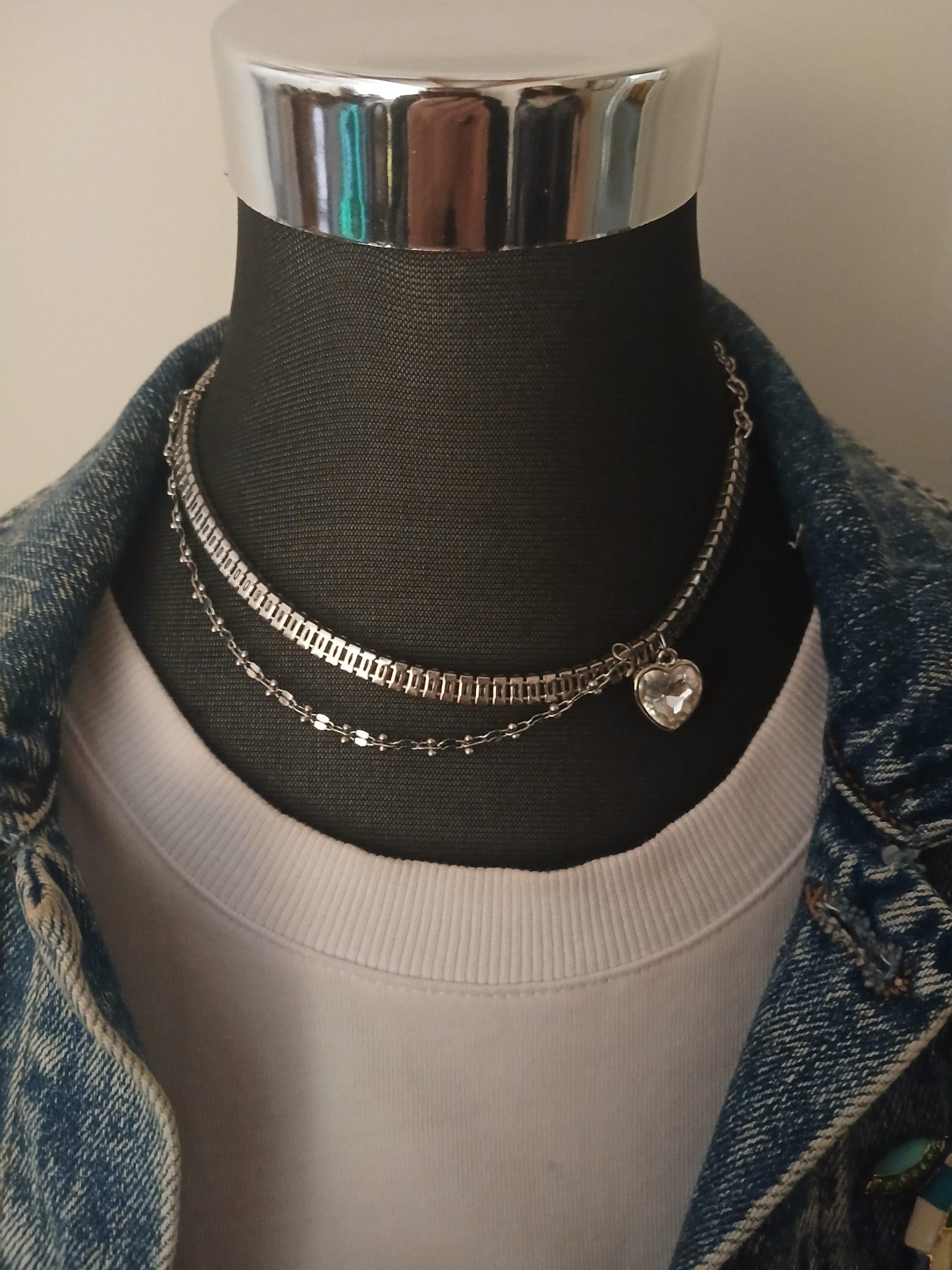 Funky heart has silver toned chains, one a thick geometric, the other a more classic finer one, joined with a cute faux crystal heart. True funky vintage! …and it’s adjustable.