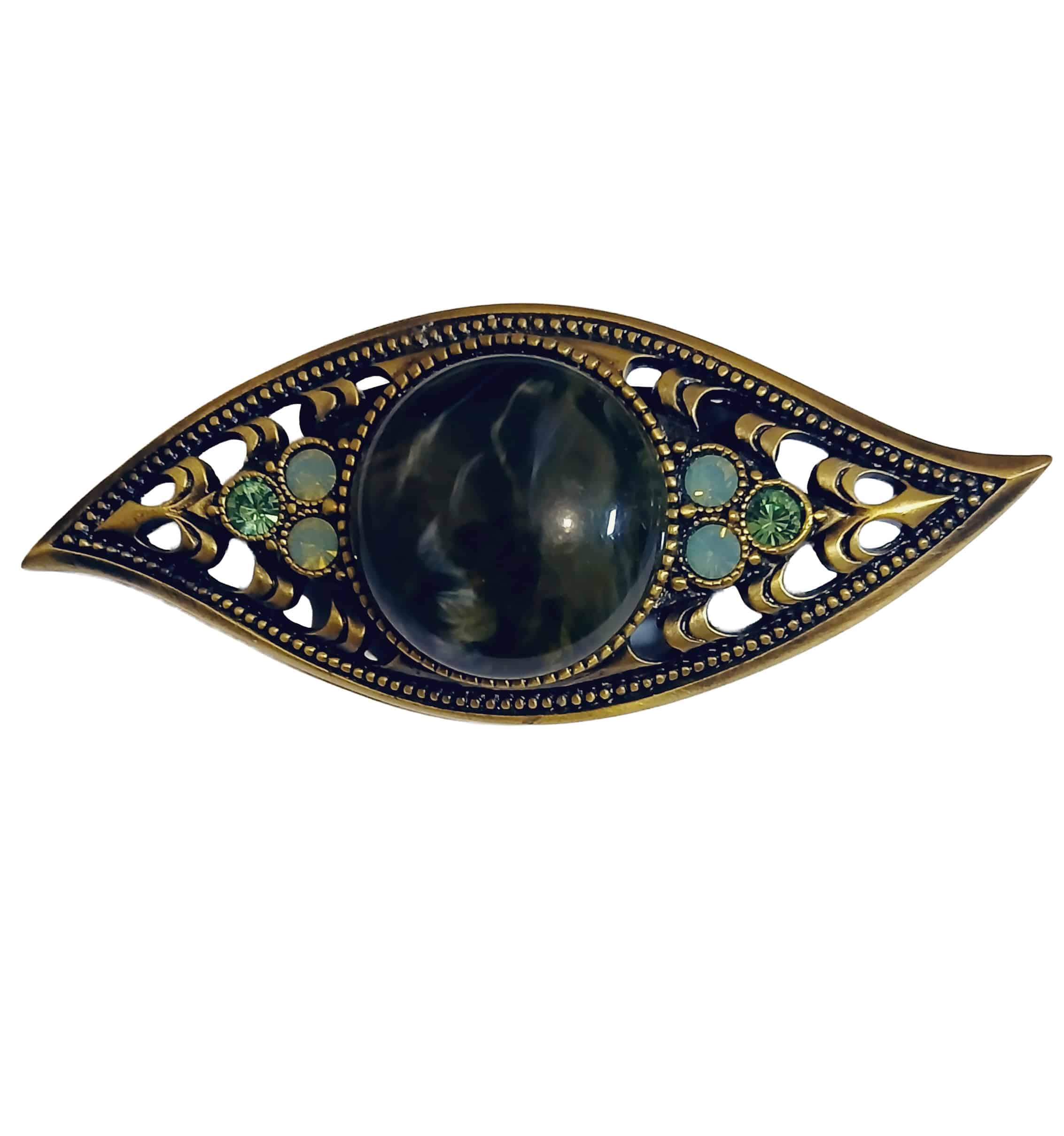 This Vintage Nephrite jade brooch signed AGIL showcases a central green stone, surrounded by delicate tiny light blue opals and crystal accents, intricate metal work likely crafted from brass, adding to its unique charm. The combination of colours and materials highlights the craftsmanship and artistic design of the piece.