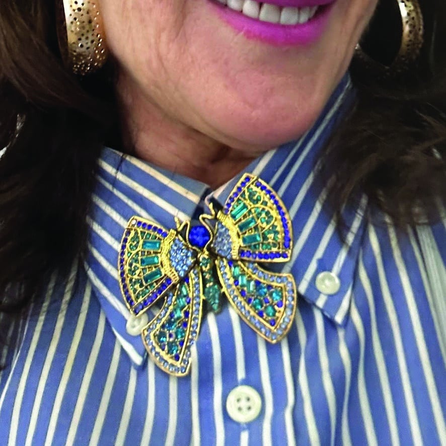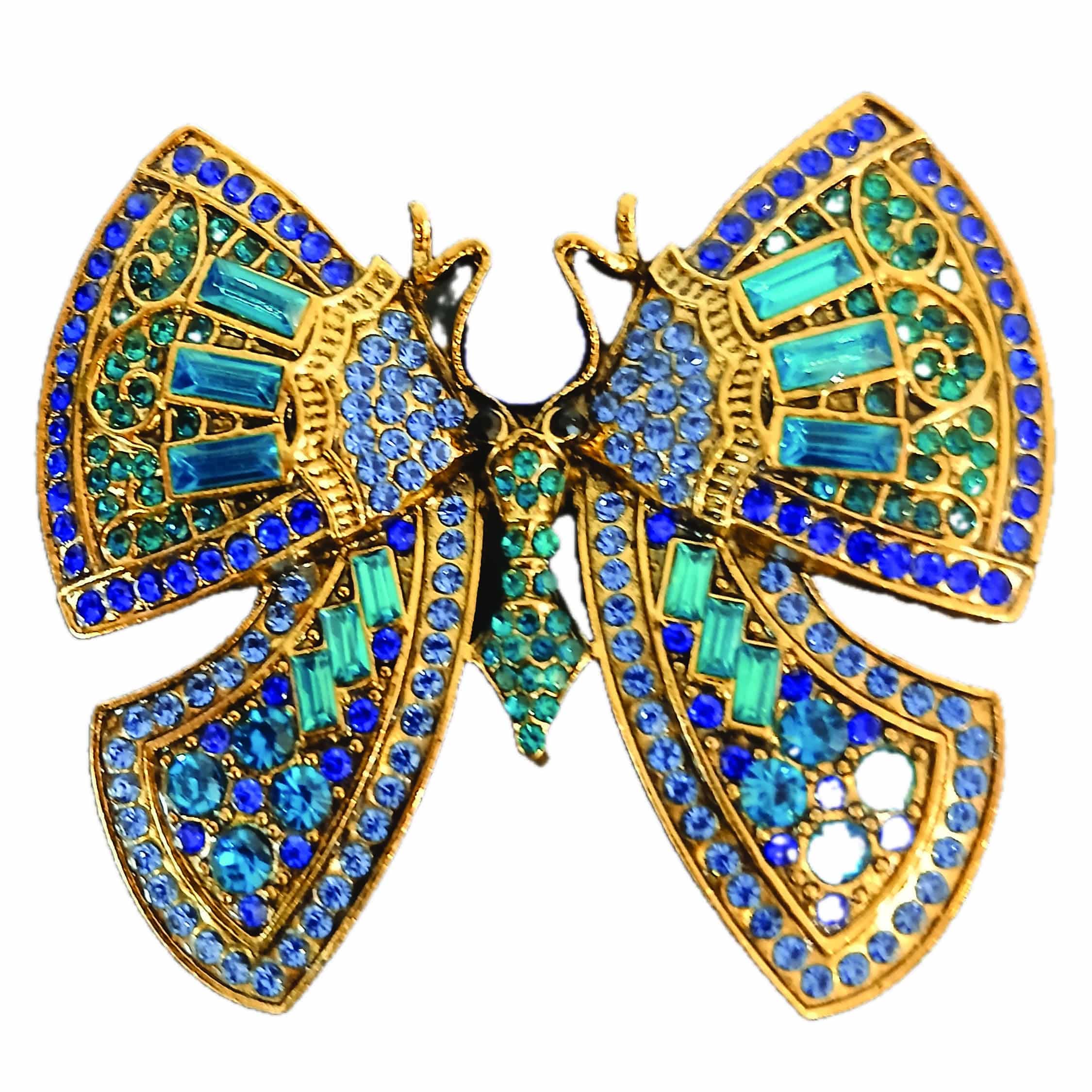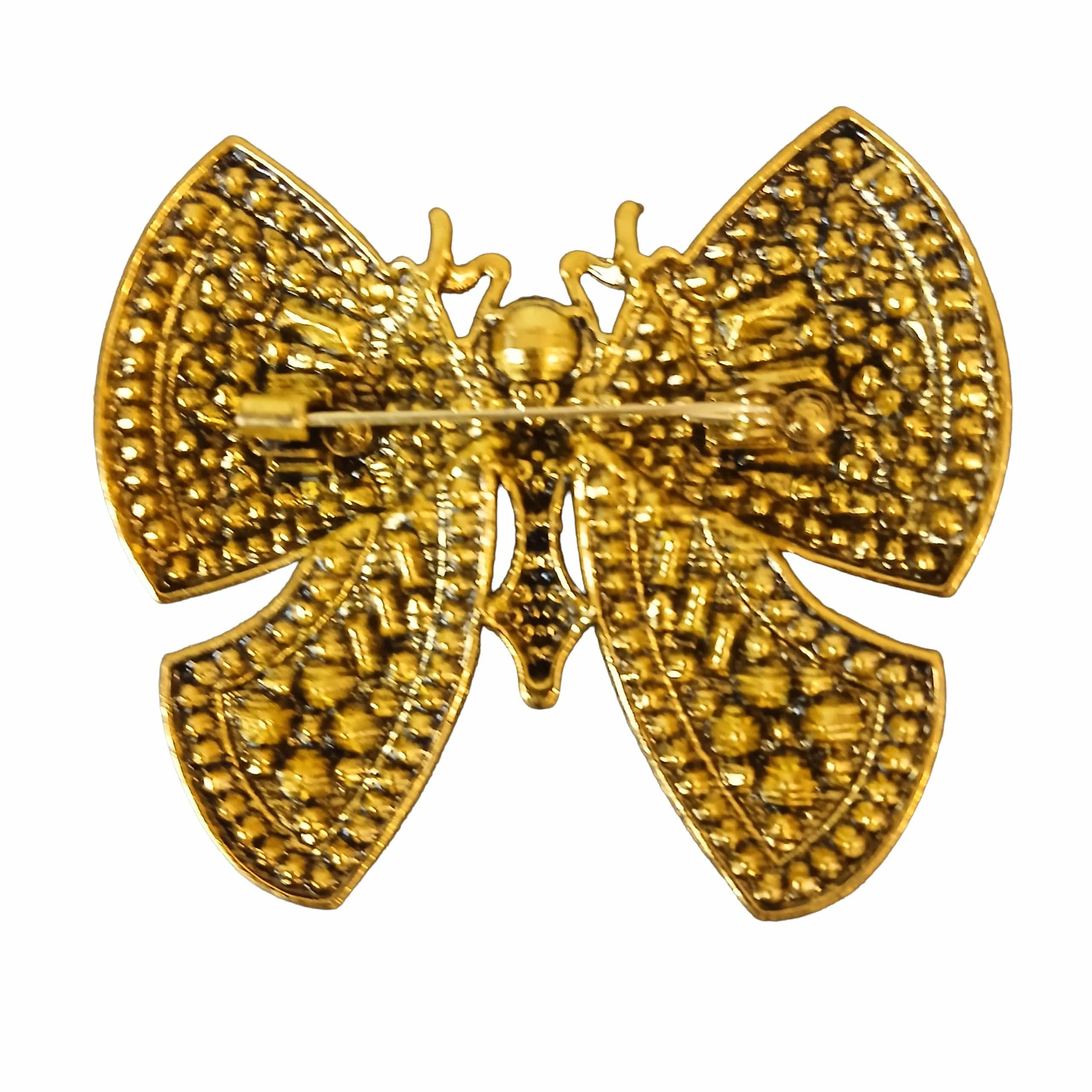 This grand, vintage look butterfly brooch has gold tones with tiny turquoise & blue coloured stones