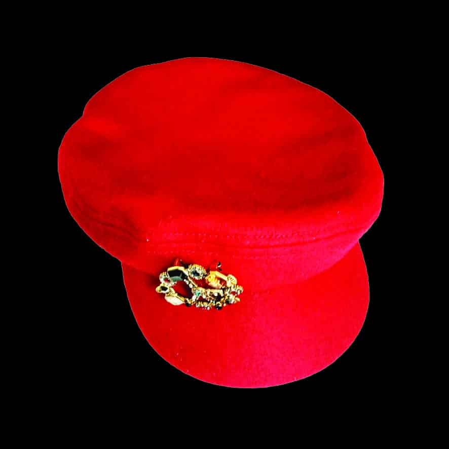 We have combined a vintage paperboy/fisherman style red pure wool cap with our “Oh Yoko*” with it’s pretty rhinestone and fax sone inlay on alloy setting. Each can be bought seperately – the brooch in our “Newley Brooched” category and the cap here in “Head Wear”.