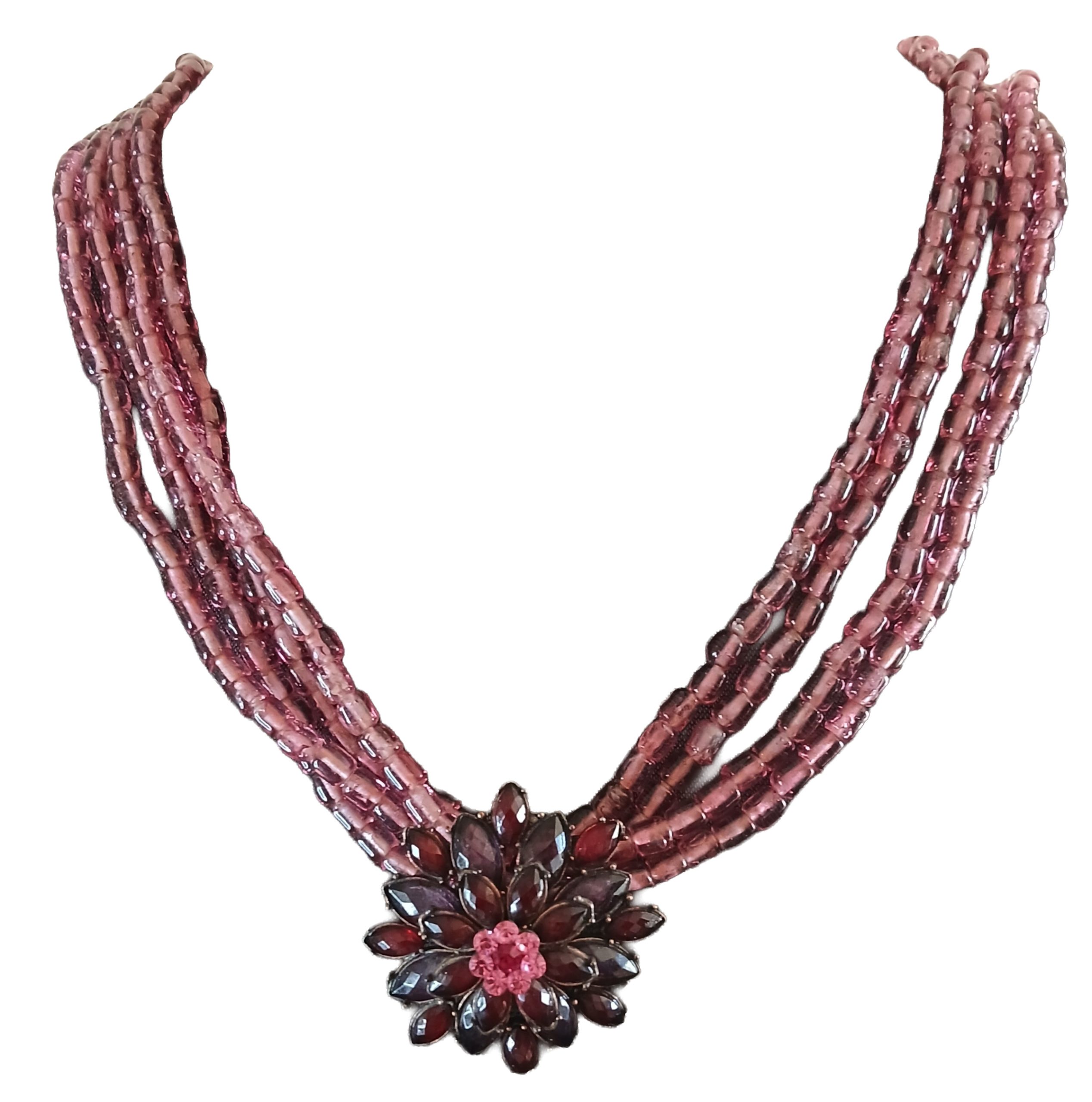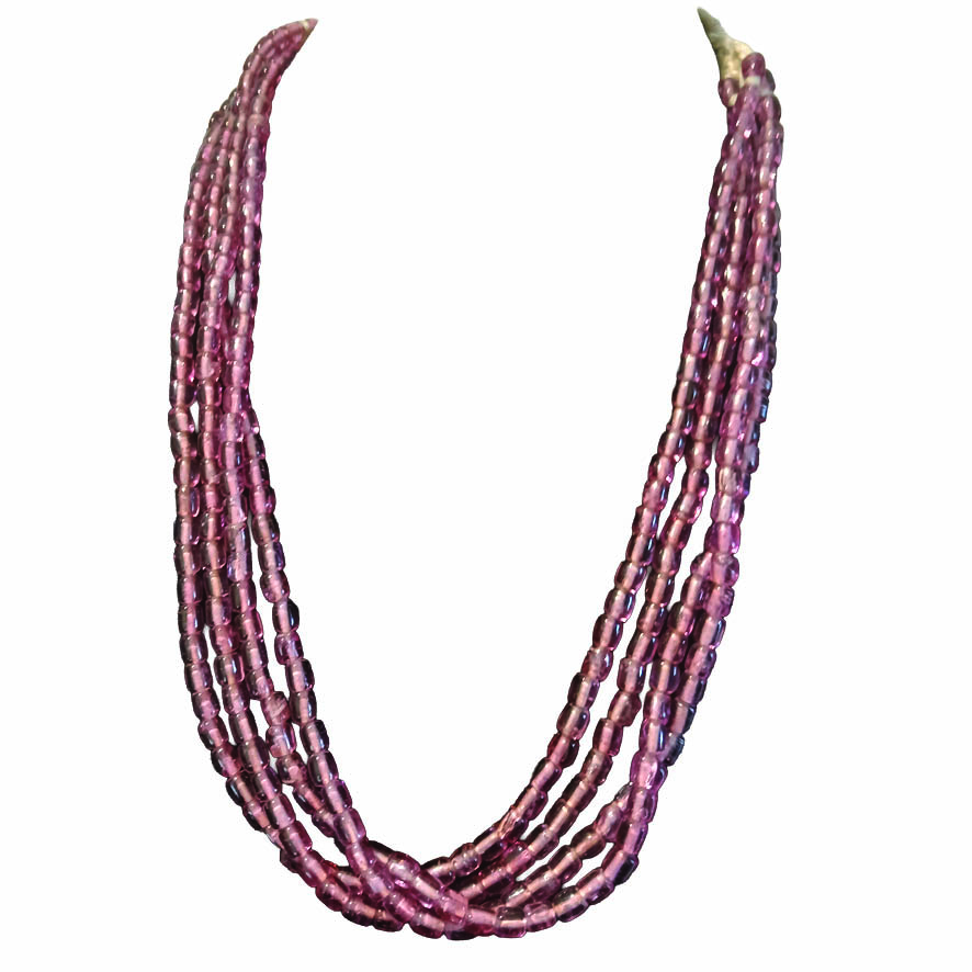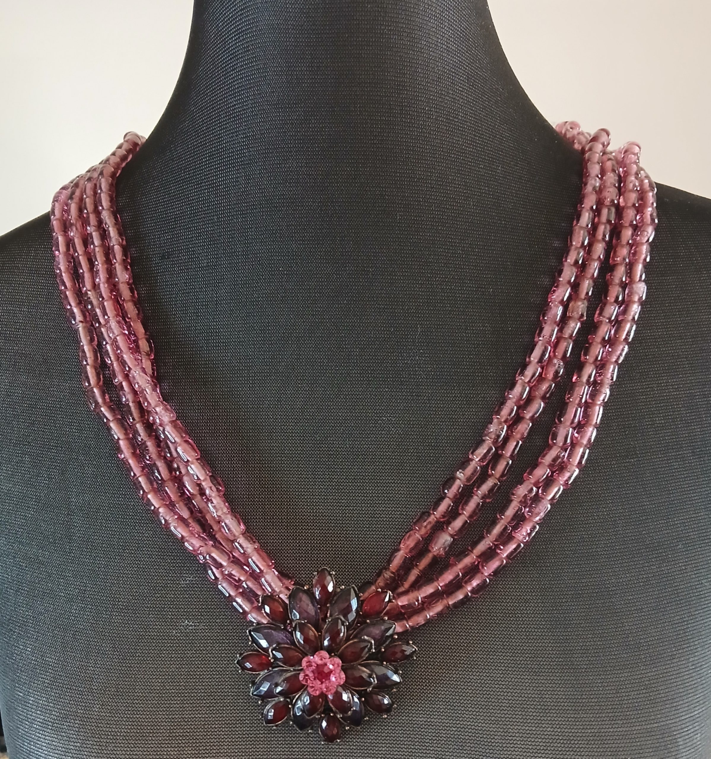 The Ruby Tuesday necklace is a vintage multi-strand necklace of ruby pink glass beads.