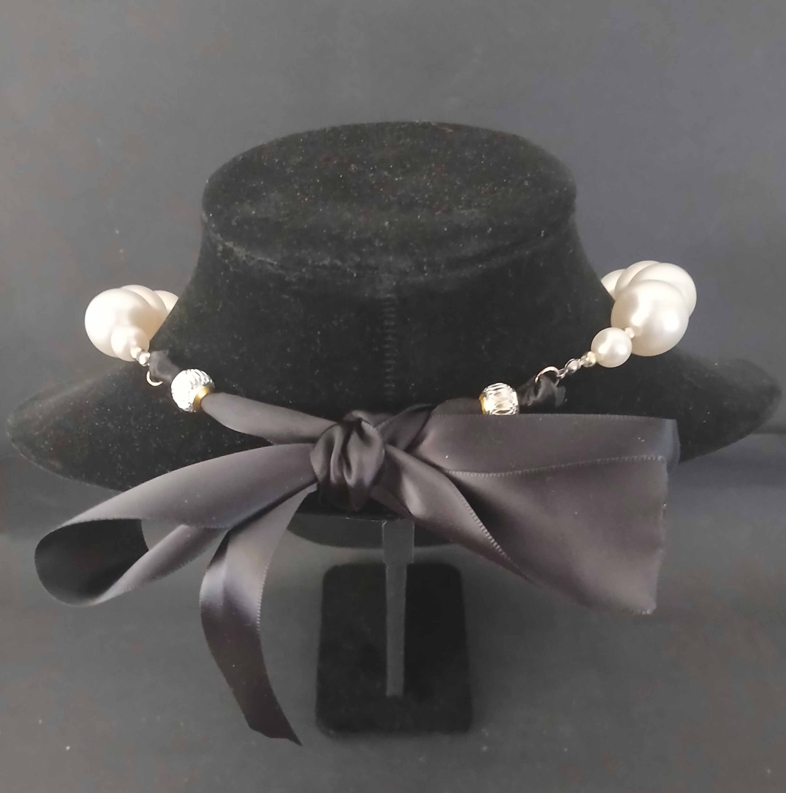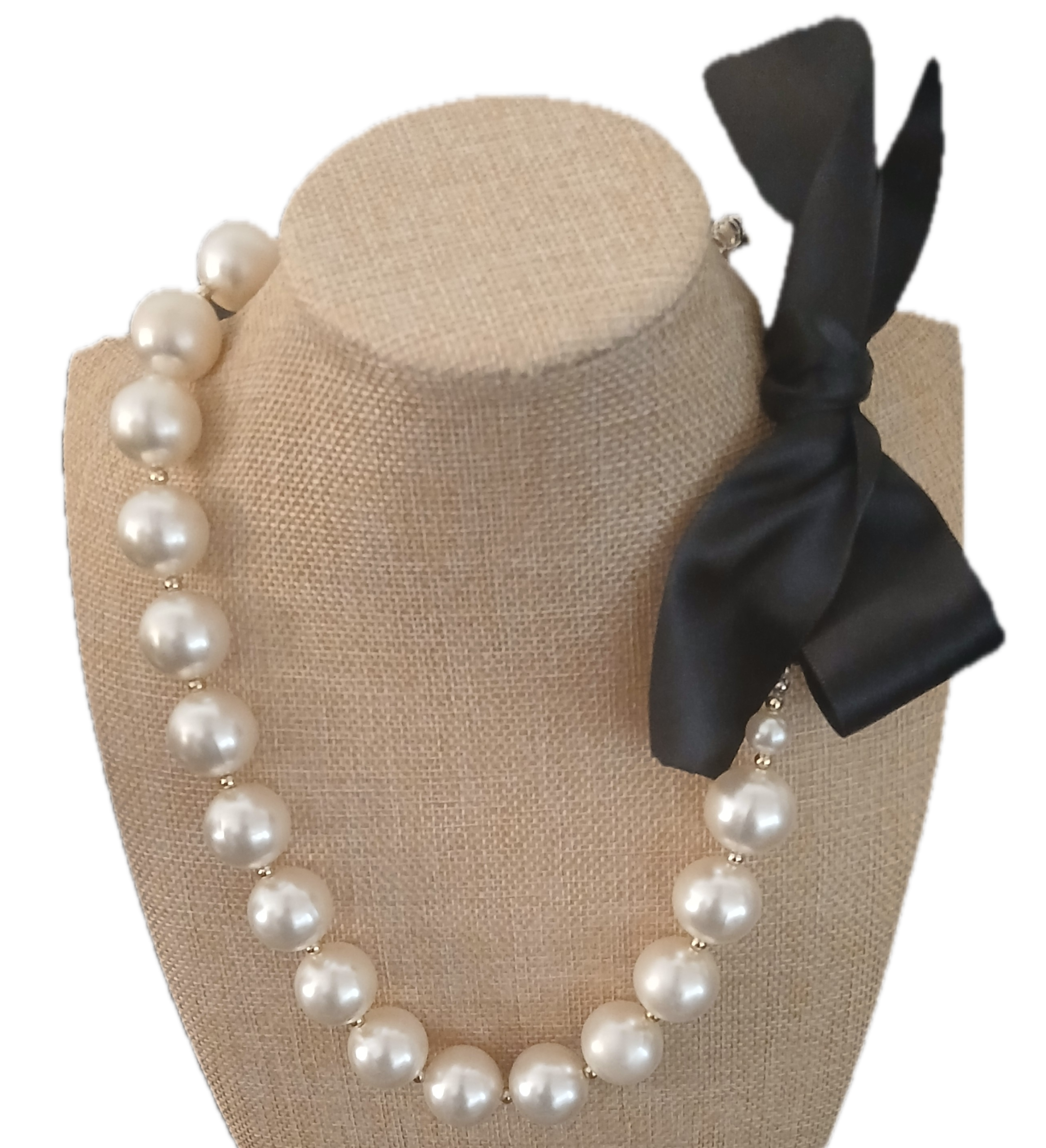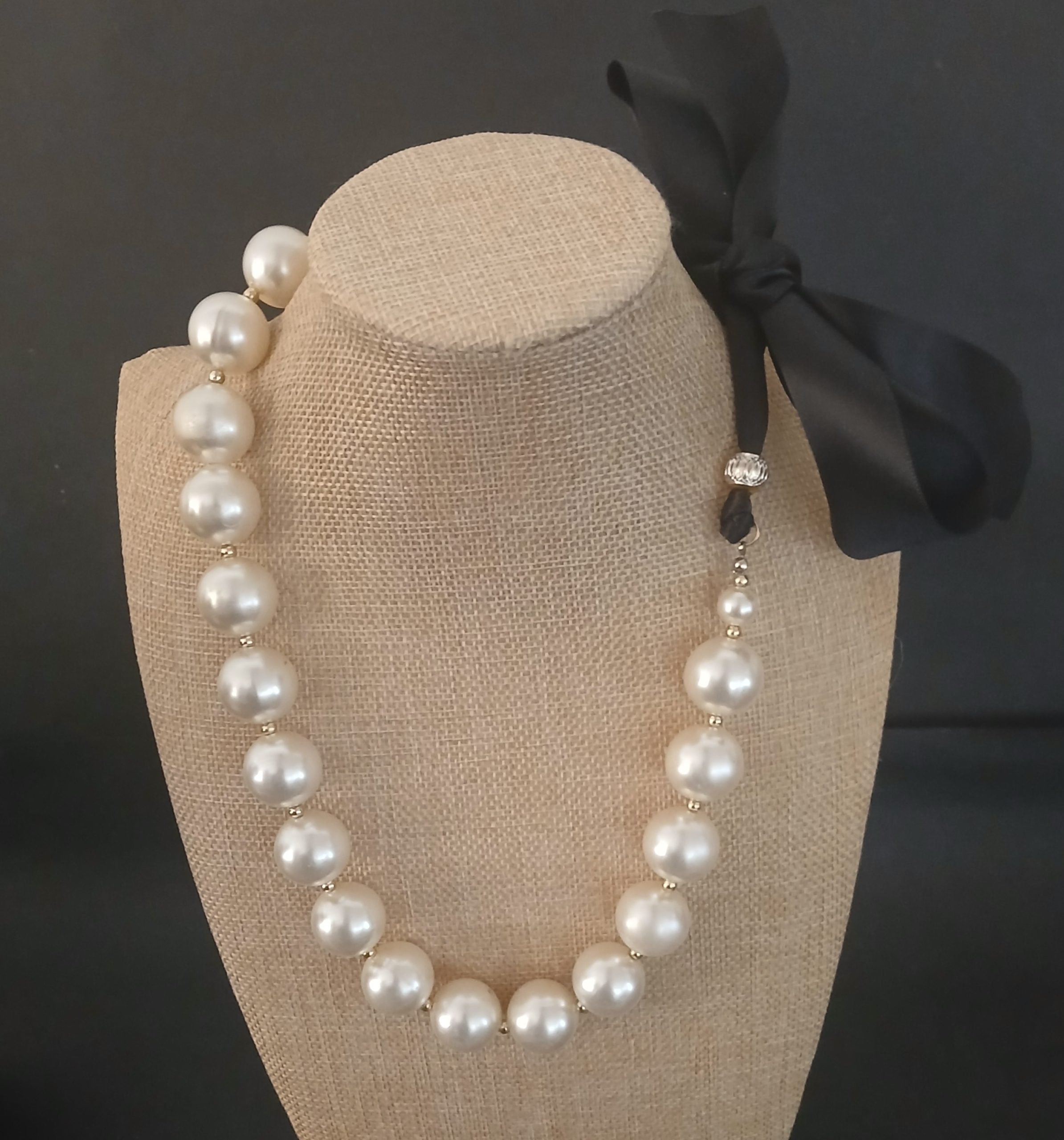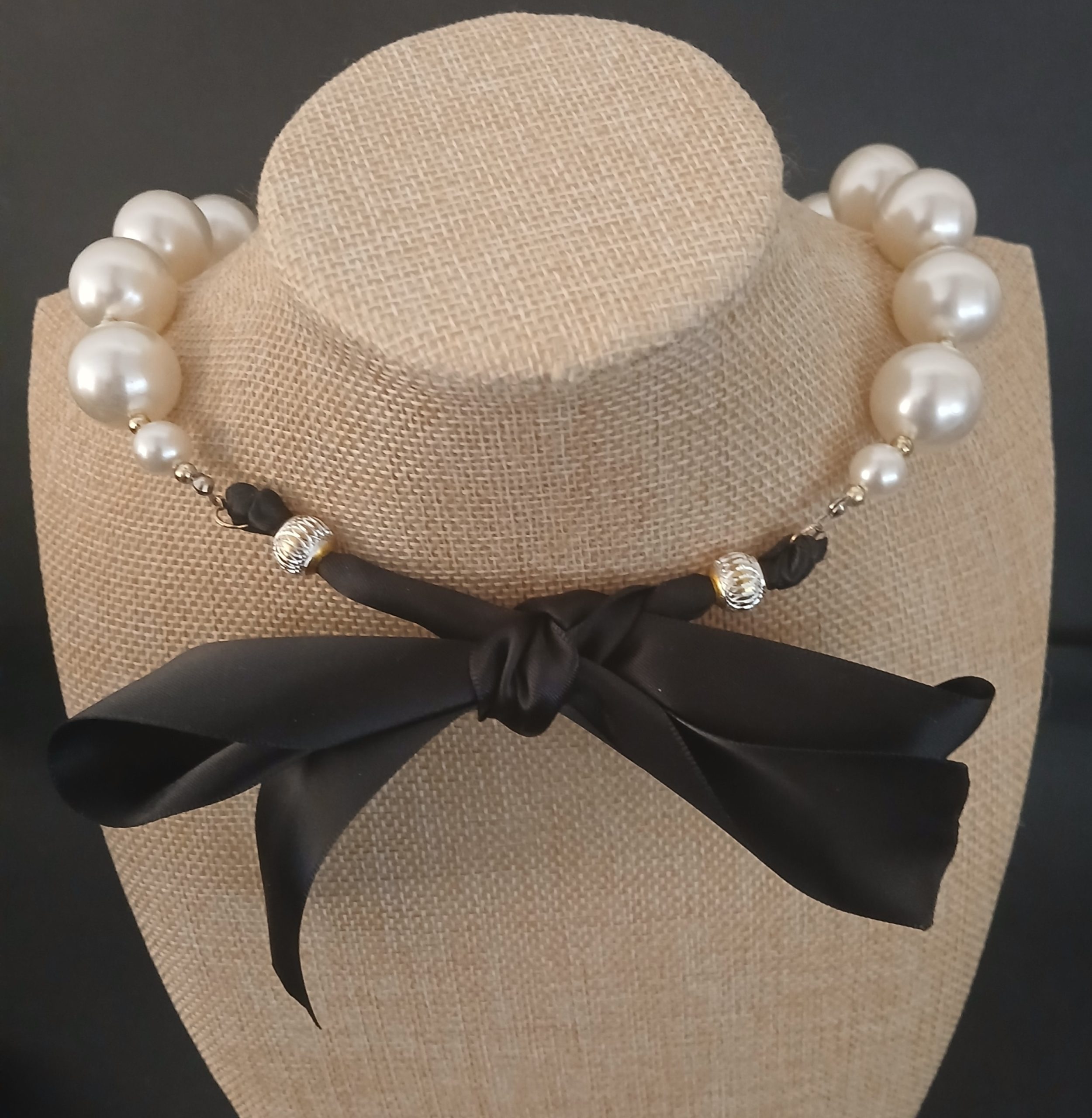 Satin n Pearls at Large, like its near namesake (just sold) is a vintage pearl necklace with black satin ribbon knotted between large faux pearls…. only with larger pearls in this case.