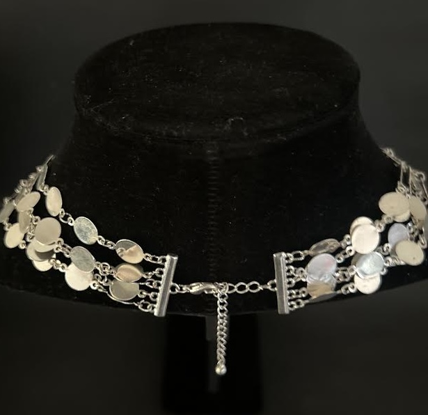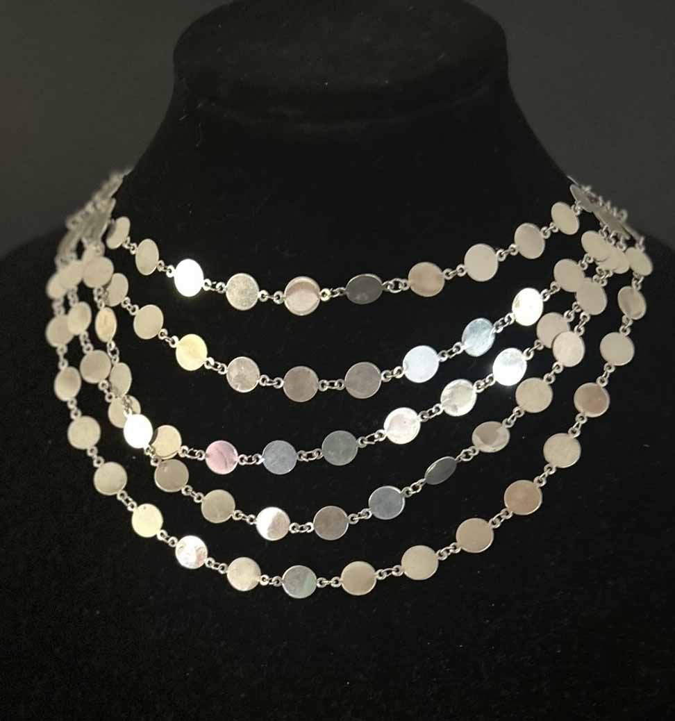 Trinny, named after one of our curator’s inspirational fashionistas – Trinny Woodall; this funky vintage, five strand necklace is just the type of mid-century necklace she would be be combining with her so, so, on trend, outfits in her podcasts. Simple, but stunning, it’s silver toned discs, each one separated by two chain links, will add sparkle to any outfit.