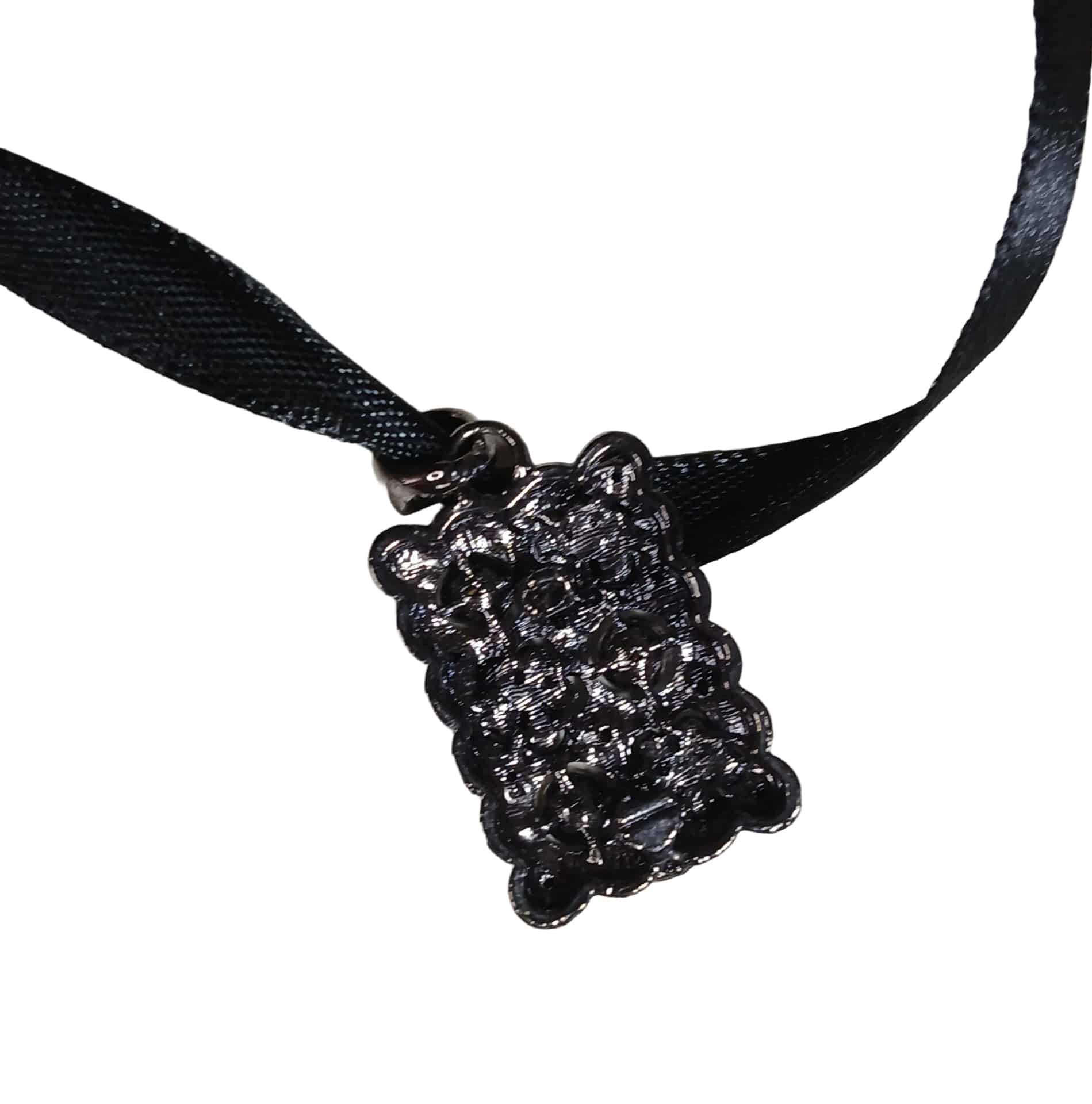 Domino is a vintage pendent of black rhinestones which we have pictured with a simple black ribbon in the place of a chain for the purpose of displaying it.